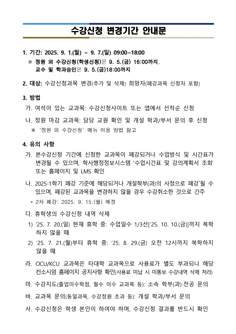 2025-2학기 학부 수강신청 변경기간 안내